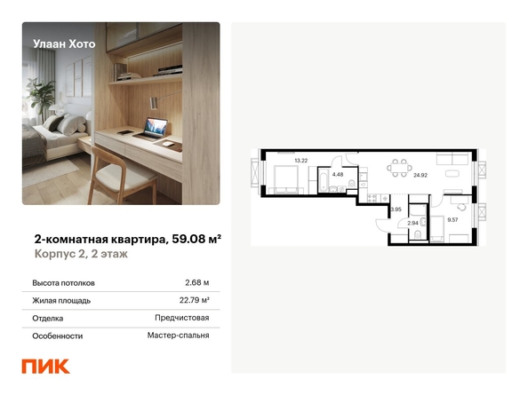 Продаётся 2-комн.квартира площадью 59.08 кв.м на 4 этаже 12 этажного дома (Корпус 2, секция 4) проекта ПИК Улаан Хото. Светлый просторный подъезд на уровне земли, функциональная планировка, большие окна. <br> <br>«Улаан Хото» — это уникальный и знаковый проект, расположенный в самом сердце Улан-Удэ. ПИК создаёт его с уважением к традициям, вдохновляясь культурой Бурятии. Мы учли все детали: от планирования территории до создания современной архитектуры с использованием традиционных элементов. <br> <br>ПИК создаст в Улан-Удэ будущую точку притяжения, которая подарит жителям новый стиль жизни — жилой квартал в центре города, где в шаговой доступности есть всё для комфорта, образования и культурного досуга. Помимо 15 жилых домов, в проекте появится два детских сада, школа, поликлиника и многоуровневые паркинги. Ещё на территории квартала появится обновленный технопарк «Кванториум», который объединит молодые таланты в сфере высоких технологий. <br> <br>Вдоль «Улаан Хото» протянется прогулочный бульвар с буддийской ступой. Он соединит Национальный музей и театр «Байкал», которые будут построены в национальном стиле с использованием архитектурных элементов и цветов, отражающих культуру Бурятии. Кроме того, ПИК отреставрирует старинные деревянные дома, которые признаны объектами культурного наследия, и вдохнет в них новую жизнь. <br> <br>В «Улаан Хото» можно выбрать планировку под любой жизненный сценарий: есть варианты с мастер-спальней, кухней-гостиной и гардеробной. Из окон квартир, расположенных на верхних этажах, будет открываться панорамный вид на город и живописный пейзаж реки. В проекте можно выбрать квартиру с предчистовой отделкой или без отделки. <br> <br>Мы создадим максимум комфорта для жителей. Во дворах, свободных от машин, появятся приватные пространства для игры, спорта и спокойного отдыха. А на первых этажах расположатся коммерческие помещения, где откроются кафе и рестораны. Здесь можно будет приятно провести время с семьей или встретиться с друзьями. Артикул - 992936
