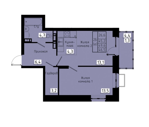 Общая площадь квартиры — 46.5 кв.м. Тип дома — монолит-кирпич. Компания-застройщик — Зеленые кварталы.