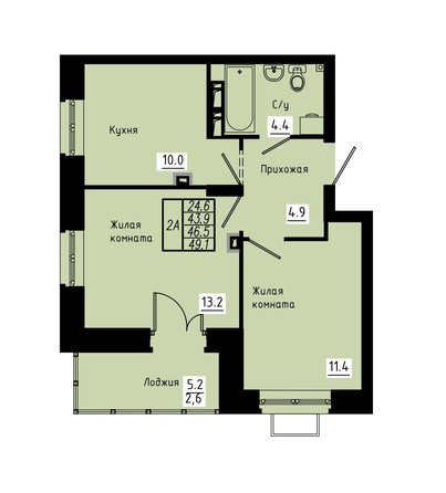 Общая площадь квартиры — 46.5 кв.м. Тип дома — монолит-кирпич. Компания-застройщик — Зеленые кварталы.