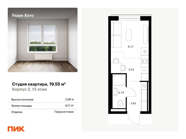 Продаётся квартира-студия площадью 19.55 кв.м на 13 этаже 16 этажного дома (Корпус 2, секция 6) проекта ПИК Улаан Хото. Светлый просторный подъезд на уровне земли, функциональная планировка, большие окна. <br> <br>«Улаан Хото» — это уникальный и знаковый проект, расположенный в самом сердце Улан-Удэ. ПИК создаёт его с уважением к традициям, вдохновляясь культурой Бурятии. Мы учли все детали: от планирования территории до создания современной архитектуры с использованием традиционных элементов. <br> <br>ПИК создаст в Улан-Удэ будущую точку притяжения, которая подарит жителям новый стиль жизни — жилой квартал в центре города, где в шаговой доступности есть всё для комфорта, образования и культурного досуга. Помимо 15 жилых домов, в проекте появится два детских сада, школа, поликлиника и многоуровневые паркинги. Ещё на территории квартала появится обновленный технопарк «Кванториум», который объединит молодые таланты в сфере высоких технологий. <br> <br>Вдоль «Улаан Хото» протянется прогулочный бульвар с буддийской ступой. Он соединит Национальный музей и театр «Байкал», которые будут построены в национальном стиле с использованием архитектурных элементов и цветов, отражающих культуру Бурятии. Кроме того, ПИК отреставрирует старинные деревянные дома, которые признаны объектами культурного наследия, и вдохнет в них новую жизнь. <br> <br>В «Улаан Хото» можно выбрать планировку под любой жизненный сценарий: есть варианты с мастер-спальней, кухней-гостиной и гардеробной. Из окон квартир, расположенных на верхних этажах, будет открываться панорамный вид на город и живописный пейзаж реки. В проекте можно выбрать квартиру с предчистовой отделкой или без отделки. <br> <br>Мы создадим максимум комфорта для жителей. Во дворах, свободных от машин, появятся приватные пространства для игры, спорта и спокойного отдыха. А на первых этажах расположатся коммерческие помещения, где откроются кафе и рестораны. Здесь можно будет приятно провести время с семьей или встретиться с друзьями. Артикул - 993207