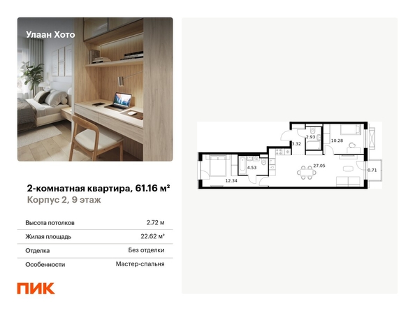 Продаётся 2-комн.квартира площадью 61.16 кв.м на 9 этаже 10 этажного дома (Корпус 2, секция 3) проекта ПИК Улаан Хото. Светлый просторный подъезд на уровне земли, функциональная планировка, большие окна. <br> <br>«Улаан Хото» — это уникальный и знаковый проект, расположенный в самом сердце Улан-Удэ. ПИК создаёт его с уважением к традициям, вдохновляясь культурой Бурятии. Мы учли все детали: от планирования территории до создания современной архитектуры с использованием традиционных элементов. <br> <br>ПИК создаст в Улан-Удэ будущую точку притяжения, которая подарит жителям новый стиль жизни — жилой квартал в центре города, где в шаговой доступности есть всё для комфорта, образования и культурного досуга. Помимо 15 жилых домов, в проекте появится два детских сада, школа, поликлиника и многоуровневые паркинги. Ещё на территории квартала появится обновленный технопарк «Кванториум», который объединит молодые таланты в сфере высоких технологий. <br> <br>Вдоль «Улаан Хото» протянется прогулочный бульвар с буддийской ступой. Он соединит Национальный музей и театр «Байкал», которые будут построены в национальном стиле с использованием архитектурных элементов и цветов, отражающих культуру Бурятии. Кроме того, ПИК отреставрирует старинные деревянные дома, которые признаны объектами культурного наследия, и вдохнет в них новую жизнь. <br> <br>В «Улаан Хото» можно выбрать планировку под любой жизненный сценарий: есть варианты с мастер-спальней, кухней-гостиной и гардеробной. Из окон квартир, расположенных на верхних этажах, будет открываться панорамный вид на город и живописный пейзаж реки. В проекте можно выбрать квартиру с предчистовой отделкой или без отделки. <br> <br>Мы создадим максимум комфорта для жителей. Во дворах, свободных от машин, появятся приватные пространства для игры, спорта и спокойного отдыха. А на первых этажах расположатся коммерческие помещения, где откроются кафе и рестораны. Здесь можно будет приятно провести время с семьей или встретиться с друзьями. Артикул - 992907