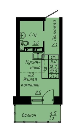 Общая площадь квартиры — 18 кв.м. Тип дома — монолит-кирпич. Компания-застройщик — Зеленые кварталы.