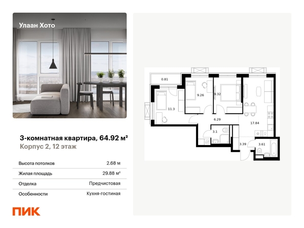 Продаётся 3-комн.квартира площадью 64.92 кв.м на 12 этаже 16 этажного дома (Корпус 2, секция 6) проекта ПИК Улаан Хото. Светлый просторный подъезд на уровне земли, функциональная планировка, большие окна. <br> <br>«Улаан Хото» — это уникальный и знаковый проект, расположенный в самом сердце Улан-Удэ. ПИК создаёт его с уважением к традициям, вдохновляясь культурой Бурятии. Мы учли все детали: от планирования территории до создания современной архитектуры с использованием традиционных элементов. <br> <br>ПИК создаст в Улан-Удэ будущую точку притяжения, которая подарит жителям новый стиль жизни — жилой квартал в центре города, где в шаговой доступности есть всё для комфорта, образования и культурного досуга. Помимо 15 жилых домов, в проекте появится два детских сада, школа, поликлиника и многоуровневые паркинги. Ещё на территории квартала появится обновленный технопарк «Кванториум», который объединит молодые таланты в сфере высоких технологий. <br> <br>Вдоль «Улаан Хото» протянется прогулочный бульвар с буддийской ступой. Он соединит Национальный музей и театр «Байкал», которые будут построены в национальном стиле с использованием архитектурных элементов и цветов, отражающих культуру Бурятии. Кроме того, ПИК отреставрирует старинные деревянные дома, которые признаны объектами культурного наследия, и вдохнет в них новую жизнь. <br> <br>В «Улаан Хото» можно выбрать планировку под любой жизненный сценарий: есть варианты с мастер-спальней, кухней-гостиной и гардеробной. Из окон квартир, расположенных на верхних этажах, будет открываться панорамный вид на город и живописный пейзаж реки. В проекте можно выбрать квартиру с предчистовой отделкой или без отделки. <br> <br>Мы создадим максимум комфорта для жителей. Во дворах, свободных от машин, появятся приватные пространства для игры, спорта и спокойного отдыха. А на первых этажах расположатся коммерческие помещения, где откроются кафе и рестораны. Здесь можно будет приятно провести время с семьей или встретиться с друзьями. Артикул - 993181