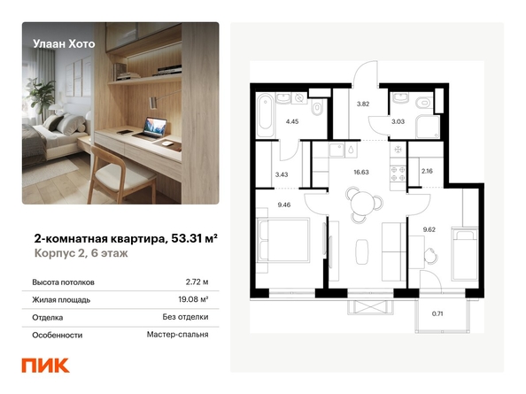Продаётся 2-комн.квартира площадью 53.31 кв.м на 6 этаже 16 этажного дома (Корпус 2, секция 1) проекта ПИК Улаан Хото. Светлый просторный подъезд на уровне земли, функциональная планировка, большие окна. <br> <br>«Улаан Хото» — это уникальный и знаковый проект, расположенный в самом сердце Улан-Удэ. ПИК создаёт его с уважением к традициям, вдохновляясь культурой Бурятии. Мы учли все детали: от планирования территории до создания современной архитектуры с использованием традиционных элементов. <br> <br>ПИК создаст в Улан-Удэ будущую точку притяжения, которая подарит жителям новый стиль жизни — жилой квартал в центре города, где в шаговой доступности есть всё для комфорта, образования и культурного досуга. Помимо 15 жилых домов, в проекте появится два детских сада, школа, поликлиника и многоуровневые паркинги. Ещё на территории квартала появится обновленный технопарк «Кванториум», который объединит молодые таланты в сфере высоких технологий. <br> <br>Вдоль «Улаан Хото» протянется прогулочный бульвар с буддийской ступой. Он соединит Национальный музей и театр «Байкал», которые будут построены в национальном стиле с использованием архитектурных элементов и цветов, отражающих культуру Бурятии. Кроме того, ПИК отреставрирует старинные деревянные дома, которые признаны объектами культурного наследия, и вдохнет в них новую жизнь. <br> <br>В «Улаан Хото» можно выбрать планировку под любой жизненный сценарий: есть варианты с мастер-спальней, кухней-гостиной и гардеробной. Из окон квартир, расположенных на верхних этажах, будет открываться панорамный вид на город и живописный пейзаж реки. В проекте можно выбрать квартиру с предчистовой отделкой или без отделки. <br> <br>Мы создадим максимум комфорта для жителей. Во дворах, свободных от машин, появятся приватные пространства для игры, спорта и спокойного отдыха. А на первых этажах расположатся коммерческие помещения, где откроются кафе и рестораны. Здесь можно будет приятно провести время с семьей или встретиться с друзьями. Артикул - 992671