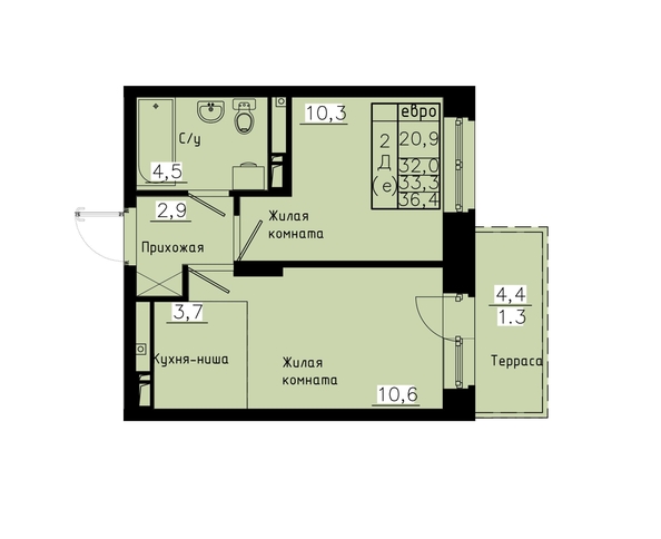 Общая площадь квартиры — 33.3 кв.м. Тип дома — монолит-кирпич. Компания-застройщик — Зеленые кварталы.