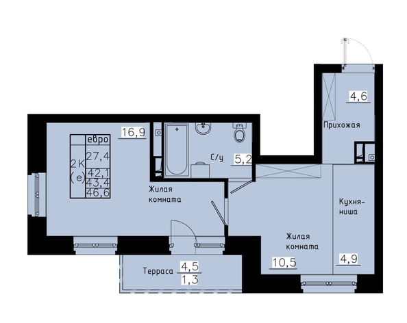 Общая площадь квартиры — 43.4 кв.м. Тип дома — монолит-кирпич. Компания-застройщик — Зеленые кварталы.