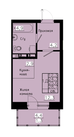 Общая площадь квартиры — 25.6 кв.м. Тип дома — монолит-кирпич. Компания-застройщик — Зеленые кварталы.