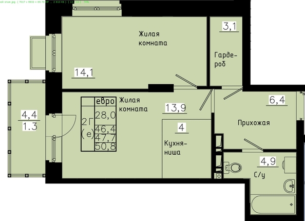 Общая площадь квартиры — 47.7 кв.м. Тип дома — монолит-кирпич. Компания-застройщик — Зеленые кварталы.