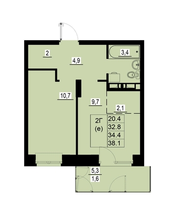 Общая площадь квартиры — 34.4 кв.м. Тип дома — монолит-кирпич. Компания-застройщик — Зеленые кварталы.