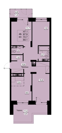 Общая площадь квартиры — 72.7 кв.м. Тип дома — монолит-кирпич. Компания-застройщик — Зеленые кварталы.