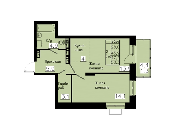 Общая площадь квартиры — 47.2 кв.м. Тип дома — монолит-кирпич. Компания-застройщик — Зеленые кварталы.
